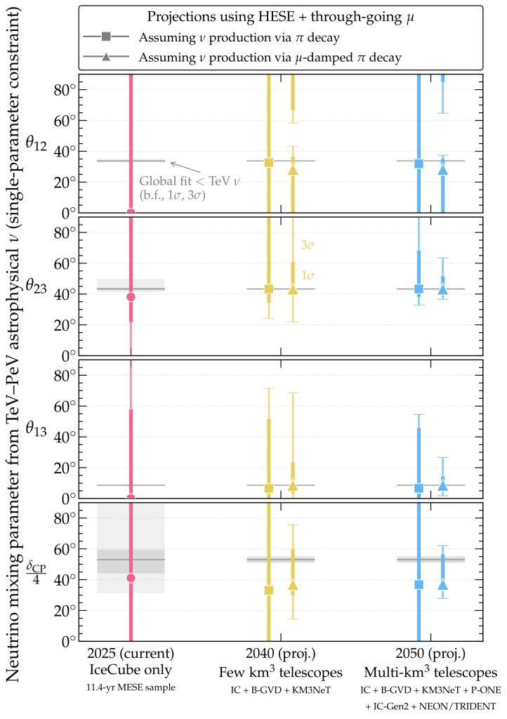 In a new paper with Qinrui Liu and Gabriela Barenboim, we have assessed in detail the power in these neutrinos to test mixing above 1 TeV, today and in the future. Concretely, we have extracted values of the four neutrino mixing angles (𝛉12, 𝛉23, 𝛉13) and the CP-violation phase (δCP) from the flavor composition of high-energy astrophysical neutrinos, i.e., the proportion of electron, muon, and tau neutrinos in their diffuse flux.