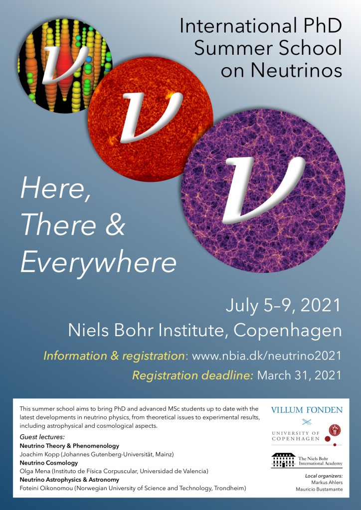 The Niels Bohr International Academy (NBIA) invites PhD students and advanced Master students to the International PhD Summer School on Neutrinos: Here, There & Everywhere. This one-week school aims to bring the participants up to date with the latest developments in neutrino physics, from theoretical issues to experimental results, including astrophysical and cosmological aspects.