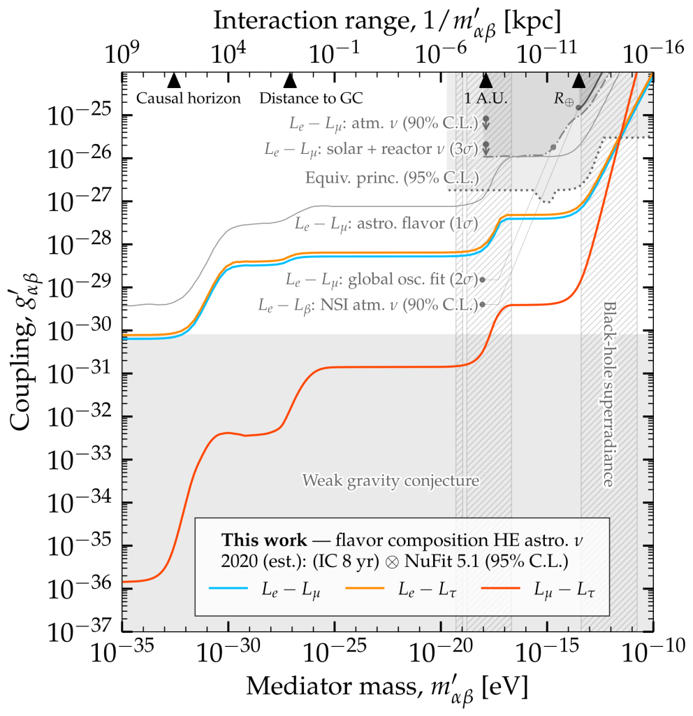 A few years ago, Sanjib Agarwalla and I published a paper on looking for new, flavor dependent, long-range neutrino-electron interactions that could affect neutrino oscillations. The new interactions are introduced by gauging lepton-number symmetries Le-Lmu and Le-Ltau. They are mediated by new neutral vector bosons, Z’. Because we considered them to be ultra-light, with masses below 10^{-10} eV, the interaction range is ultra-long. This allowed us to use the large collections of electrons in the local and distant Universe — the Earth, Moon, Sun, Milky Way, and cosmological electrons — as sources of the new matter potential, and the measurement of the flavor composition of high-energy astrophysical neutrinos as IceCube as the observable: