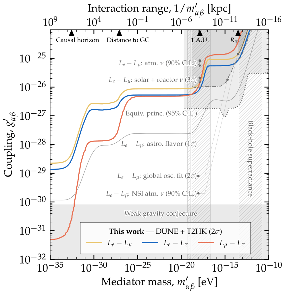 From the abstract: Alone, DUNE and T2HK may strongly constrain long-range interactions, setting new limits on their coupling strength for mediators lighter than 10^{−18} eV. However, if the new interactions are subdominant, then both DUNE and T2HK, together, will be needed to discover them, since their combination lifts parameter degeneracies that weaken their individual sensitivity.