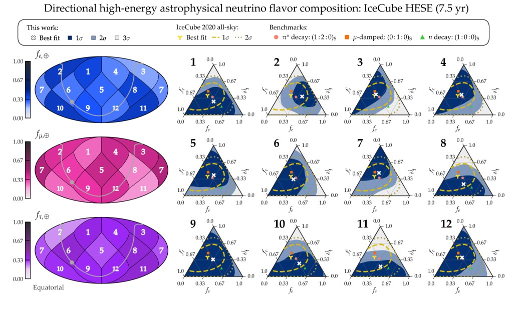 In a new paper led by NBI PhD student Bernanda Telalovic, for the first time, we bring them together to forge a new observable: the directional dependence of the high-energy neutrino flavor composition. From the distribution of arrival directions in a sample of detected events, we infer the directional dependence of the flux of electron, muon, and tau neutrinos responsible for it. To do that, we take a sample of IceCube HESE (High-Energy Starting Events) event sample and undo the detector response.