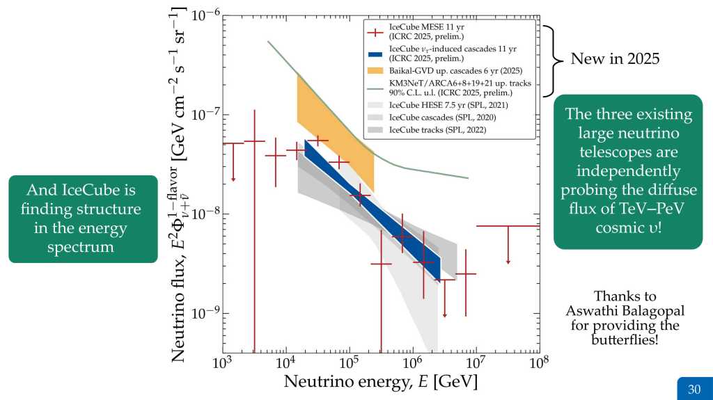 This is a slide summarizing the current state of the measurement of the TeV-PeV diffuse neutrino flux, including the new IceCube MESE measurement presented at the conference:
